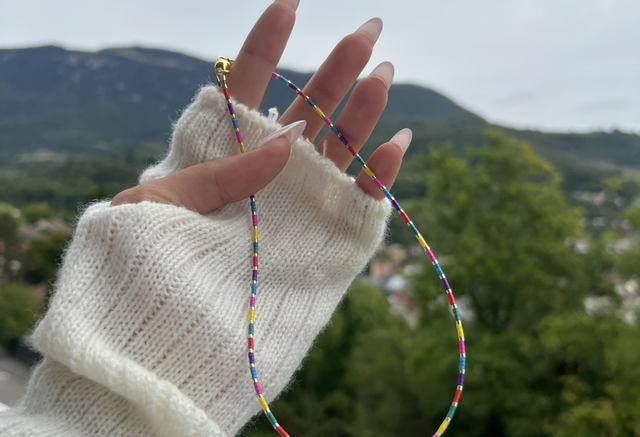 Ras de cou fin en perles rocailles Japonaises Miyuki dans des couleurs lumineuses de rose, jaune, violet, bleu, vert et doré .