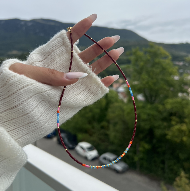 Ras de cou fin en perles rocaille Japonaise Miyuki bordeaux, rehaussé de touches colorées et dorées.